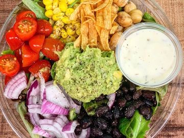 Mixed Greens. Grape Tomatoes. Red Onion. Corn. Chickpeas. Black Beans. Avocado. Ranch Dressing.