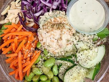 Mixed Greens. Cucumber. Edamame. Carrots. Red Cabbage. Hemp Seeds. Almond Slivers. Hummus. Green Goddess Dressing.