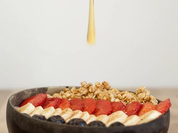 TOPPINGS: organic granola, strawberries, banana, blueberries, cinnamon, honey drizzle